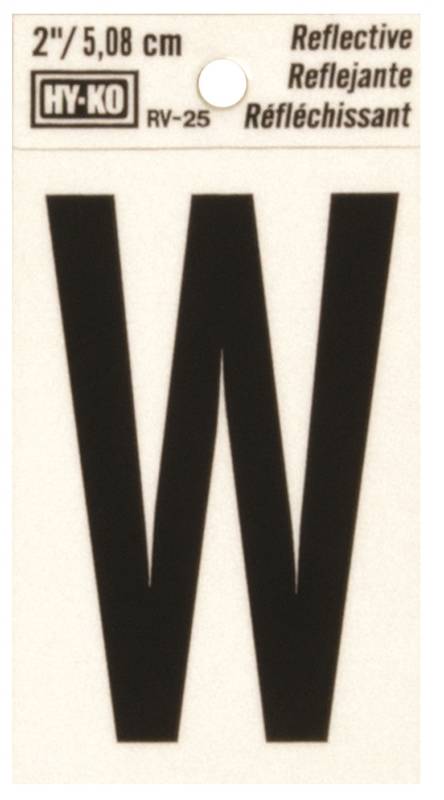 HY-KO RV-25/W Reflective Letter, Character: W, 2 in H Character, Black Character, Silver Background, Vinyl
